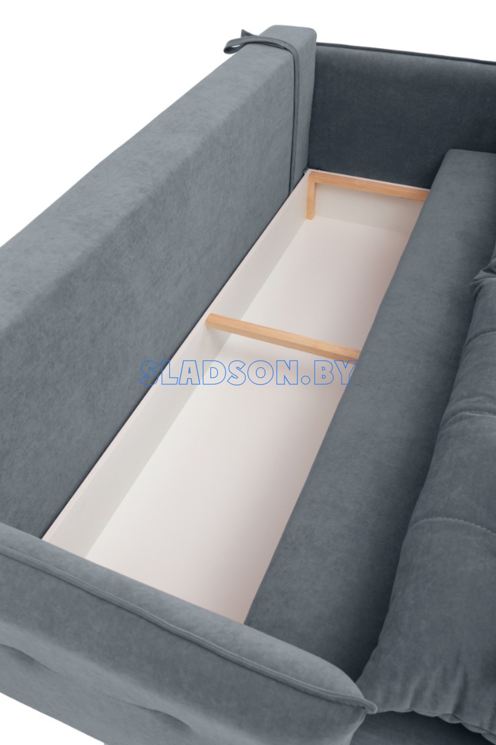 Принцип действия: сиденье дивана выдвинуть вперед до упора, открывая емкость для постельных принадлежностей, спинку уложить на освободившееся место (предварительно необходимо убрать большие подушки спинки).