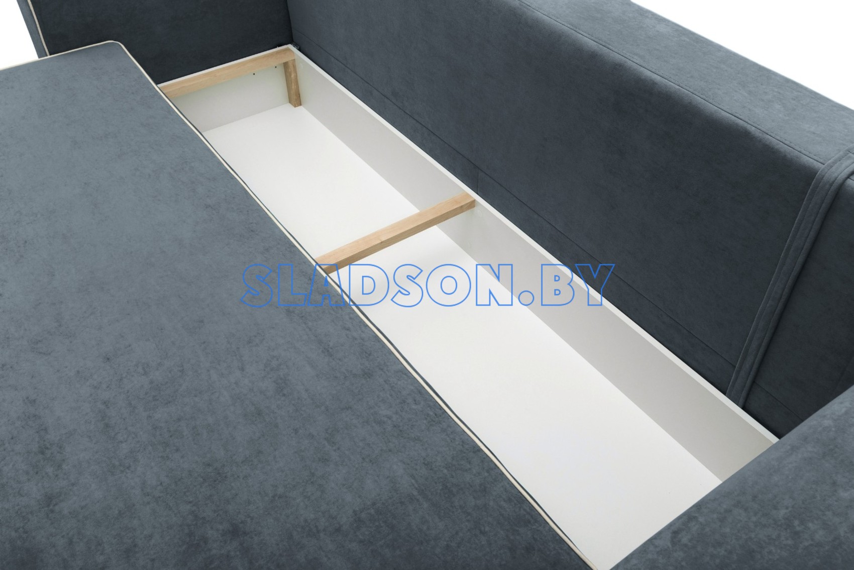 Принцип действия: сиденье дивана выдвинуть вперед до упора, открывая емкость для постельных принадлежностей, спинку уложить на освободившееся место (предварительно необходимо убрать большие подушки спинки).