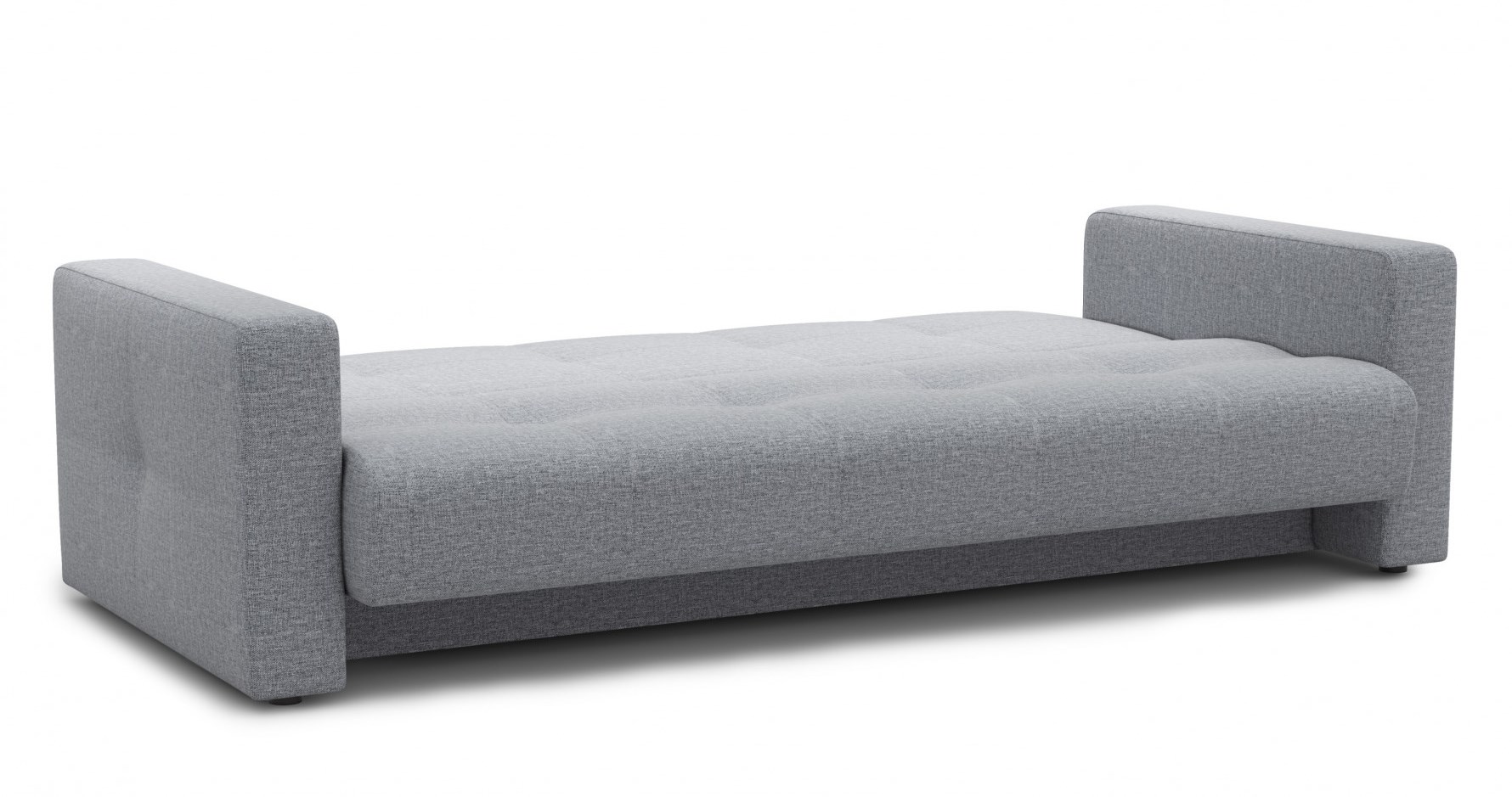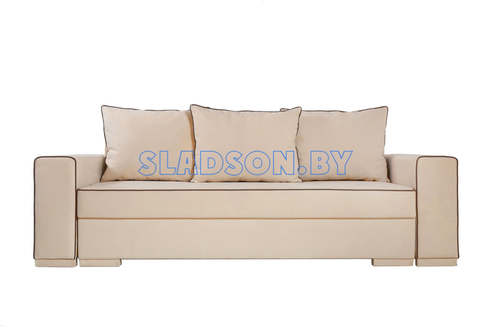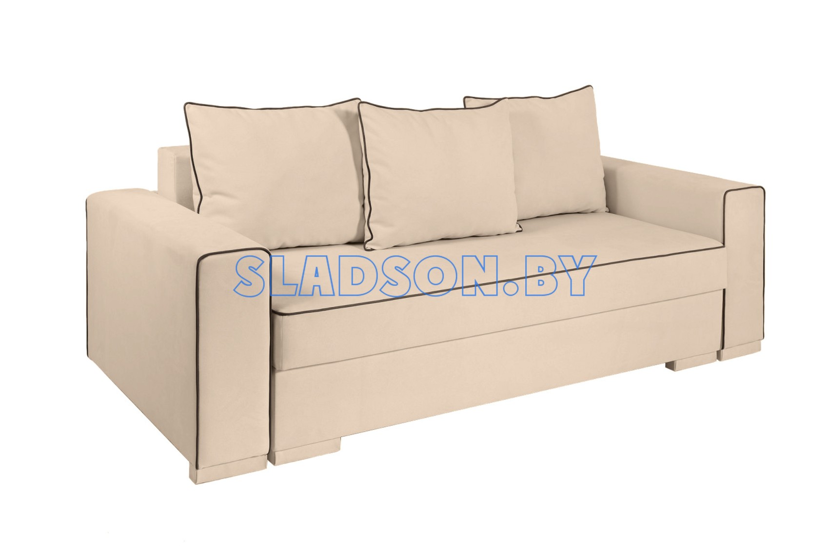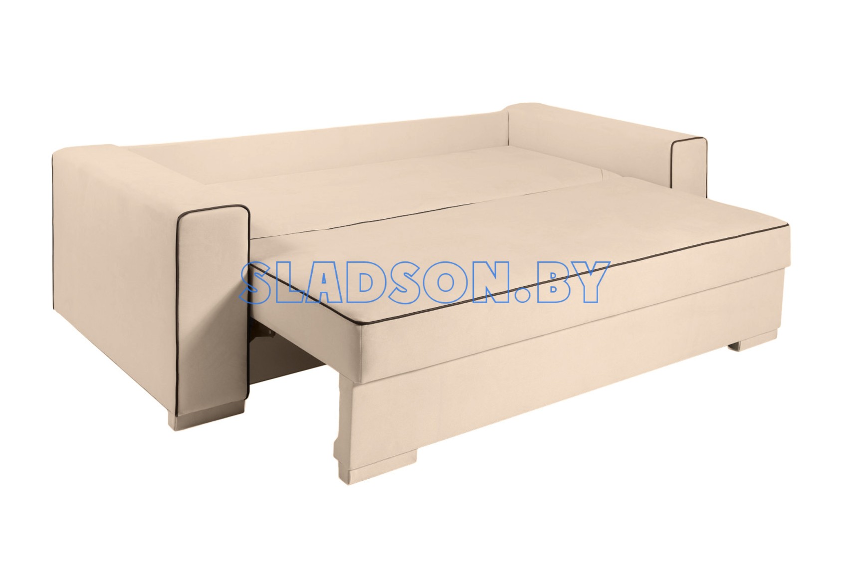Принцип действия: сиденье дивана выдвинуть вперед до упора, открывая емкость для постельных принадлежностей, спинку уложить на освободившееся место (предварительно необходимо убрать большие подушки спинки).
