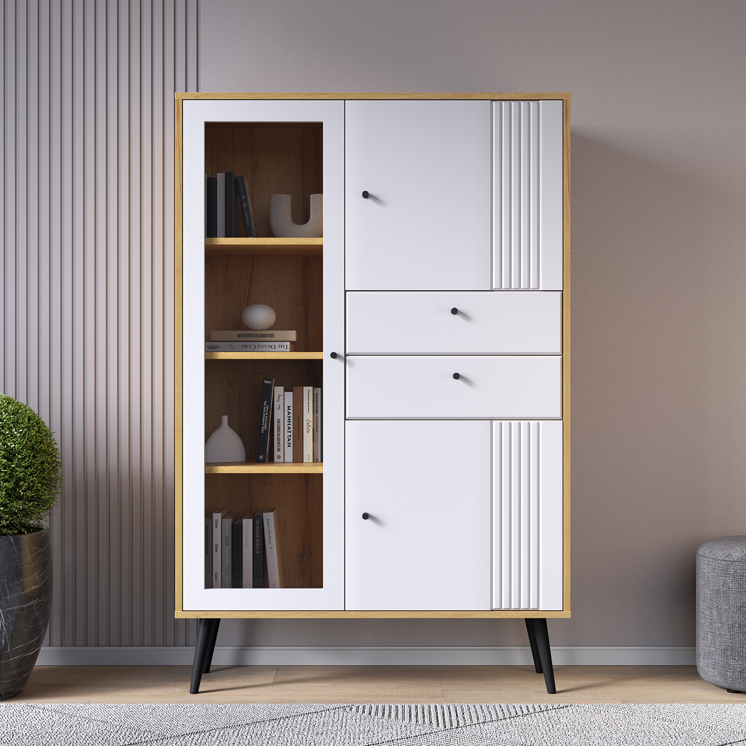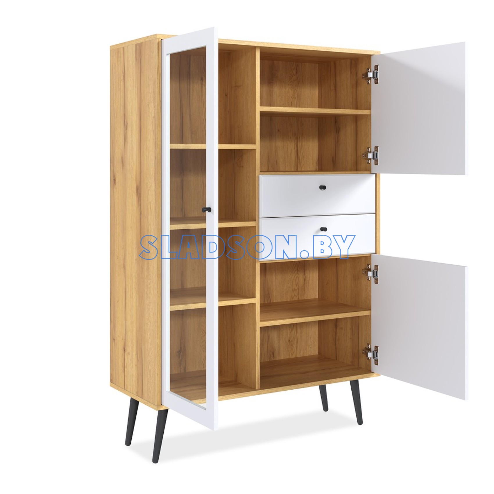 Шкаф витрина в гостиную выполнен в современном стиле с элегантными металлическими ножками, которые придают модели легкость и значительно упрощают уборку в доме. Для комфортного использования и тишины в доме распашные дверки оснащены доводчиками петель. Этот многофункциональный предмет мебели станет незаменимым элементом вашего дома, сочетая в себе практичность шкафа и презентабельность витрины шкафа.
