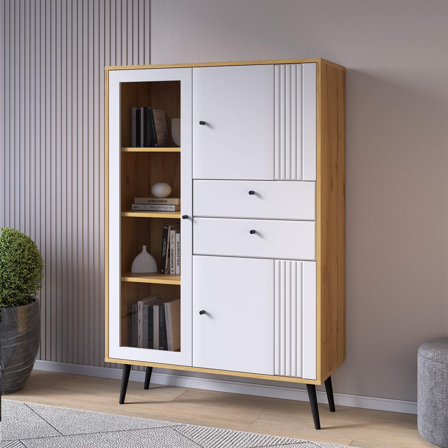 Витрина выполнена из надежных материалов: корпус ЛДСП «дуб крафт золотой», фасады МДФ в исполнениях «миндаль» или «серо-зеленый» на выбор покупателя. Лаконичный декор в виде фрезеровки фасадов в сочетании с лицевой фурнитурой в черном цвете подчеркивают стиль мебели.