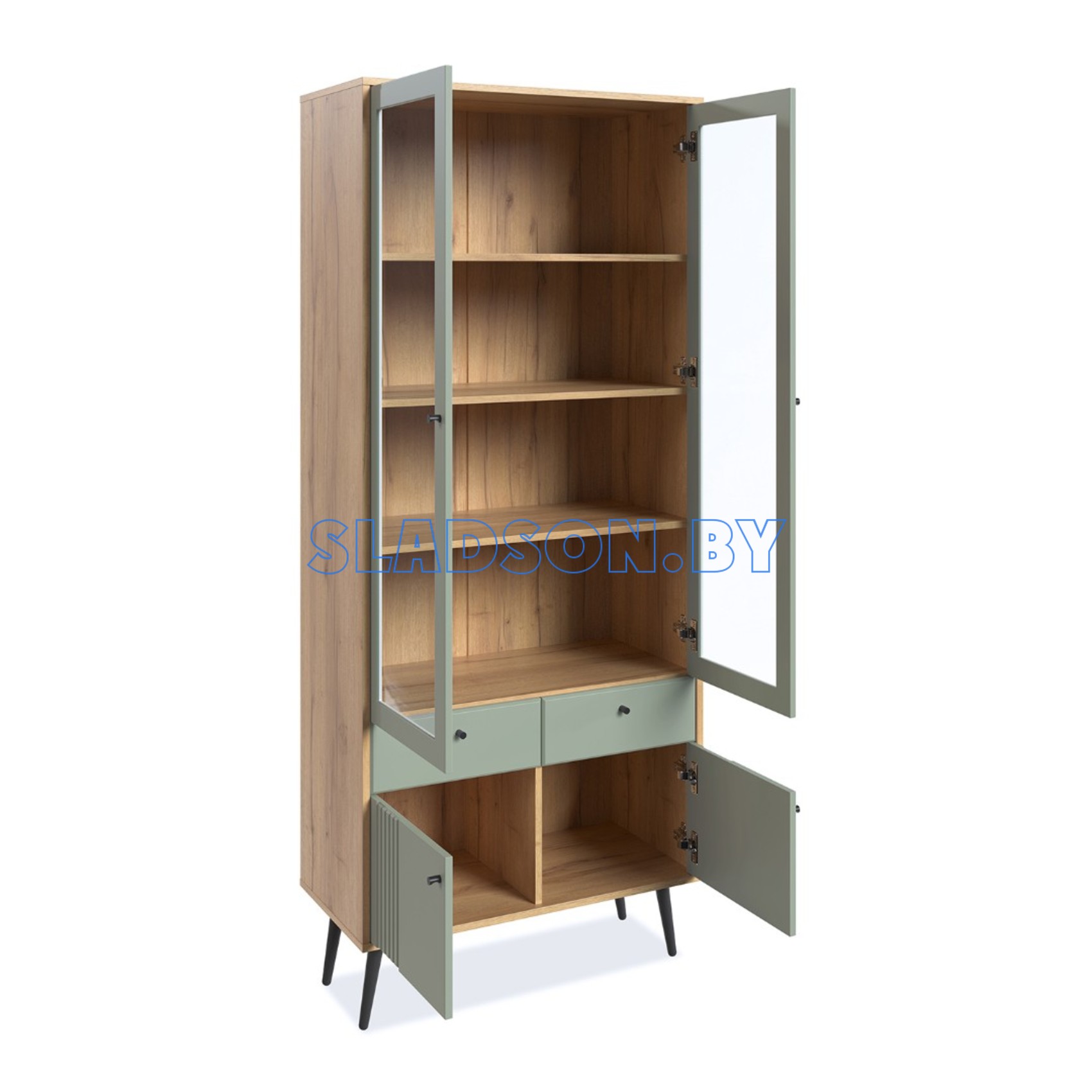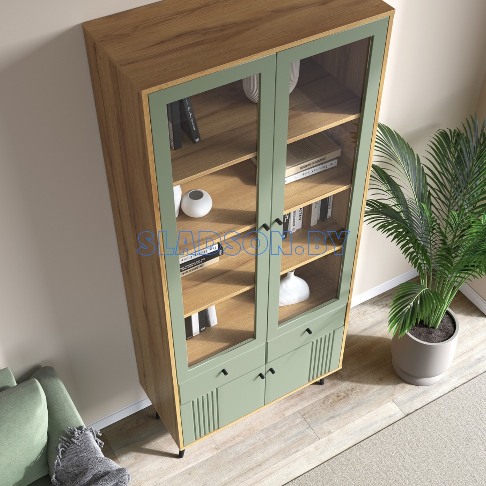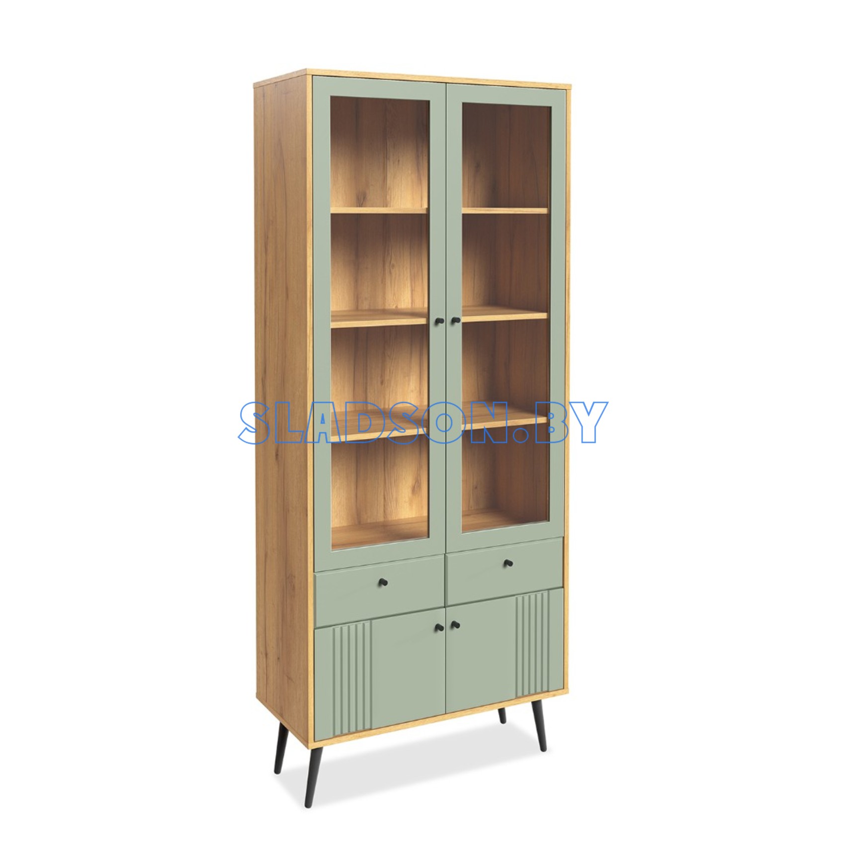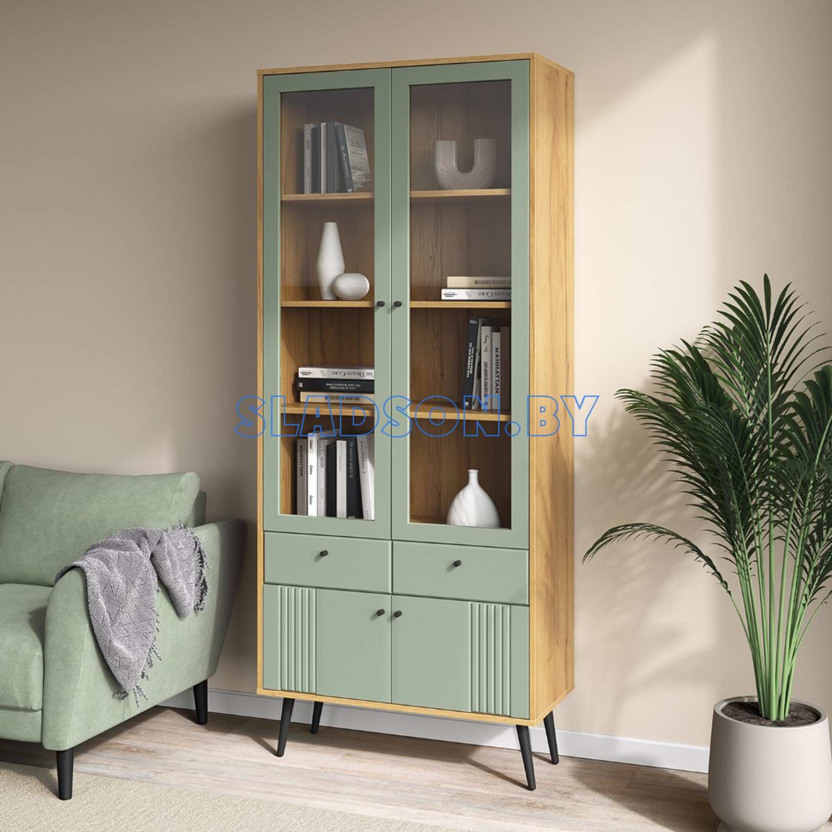 ВЕГА САКСОНИЯ гостиная Пенал-витрина 2-х дверная Дуб золотой Крафт, Серо-зеленый