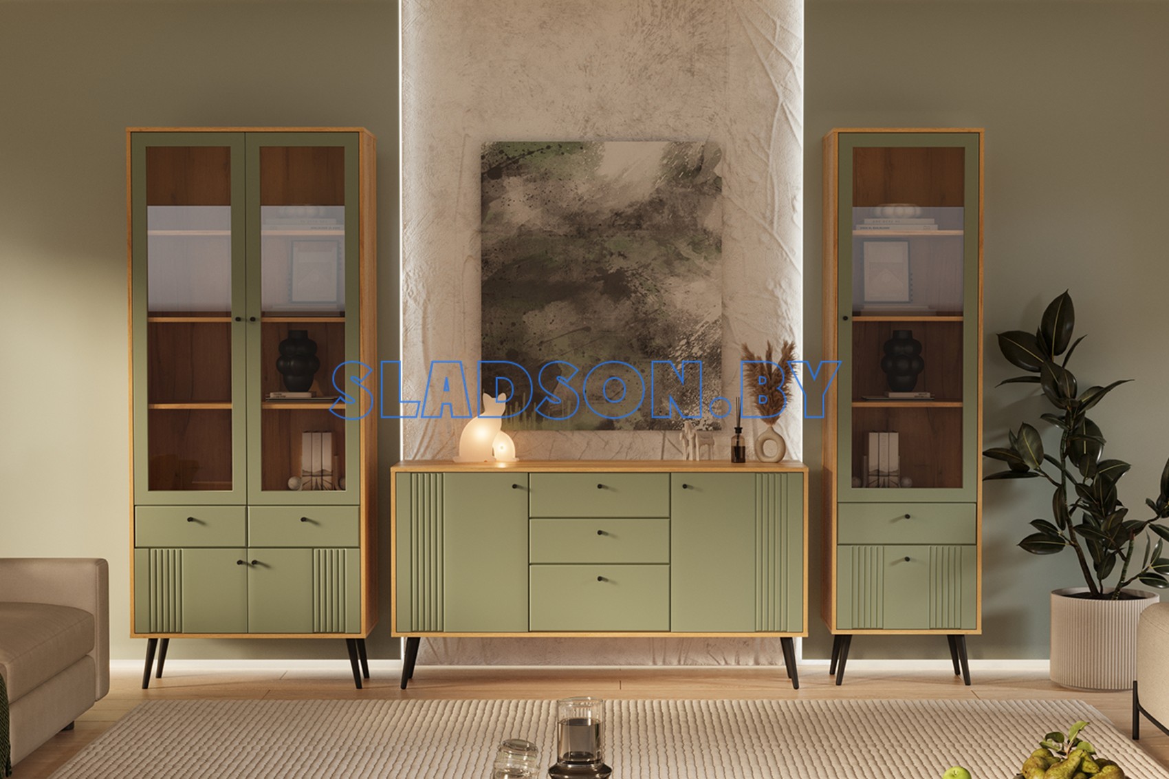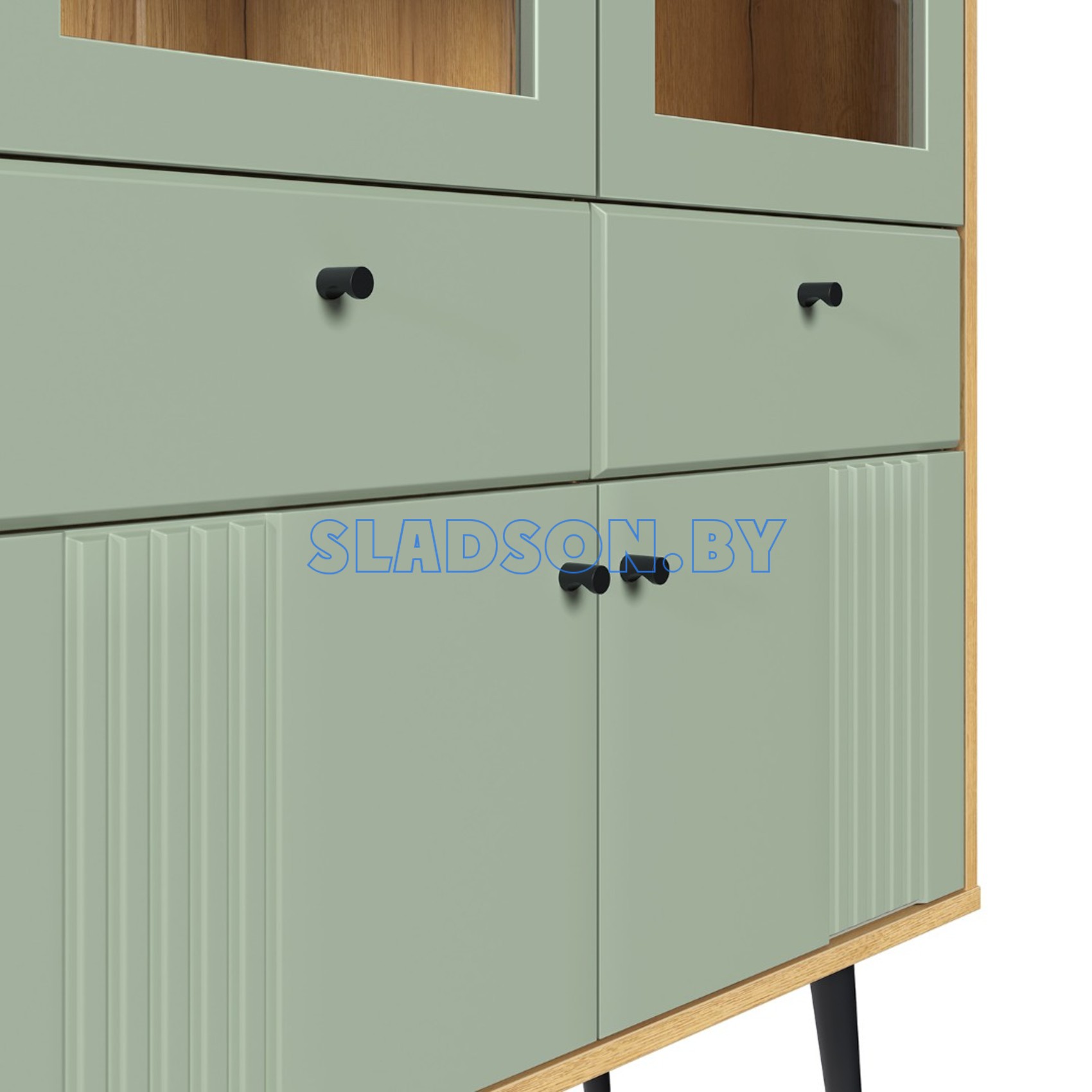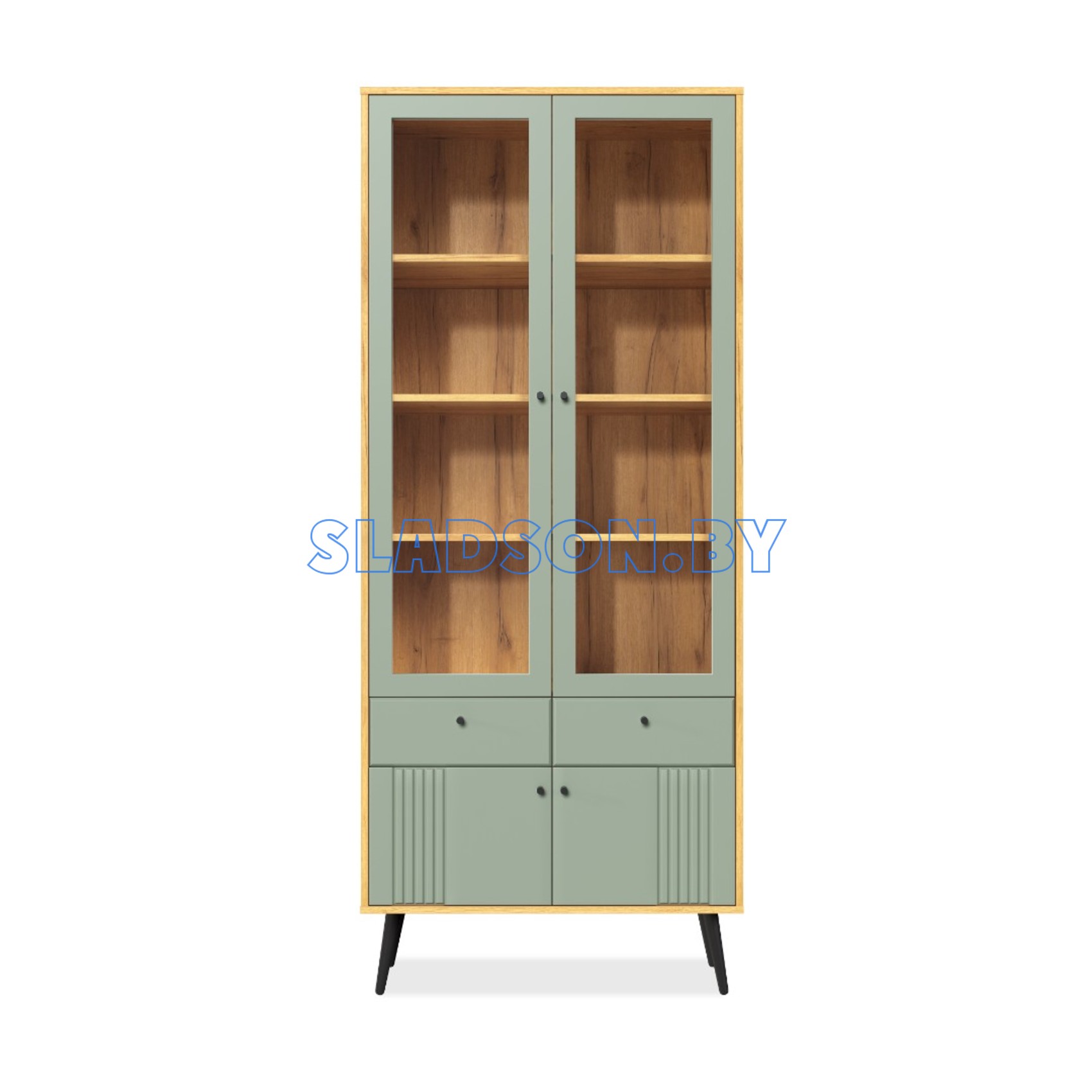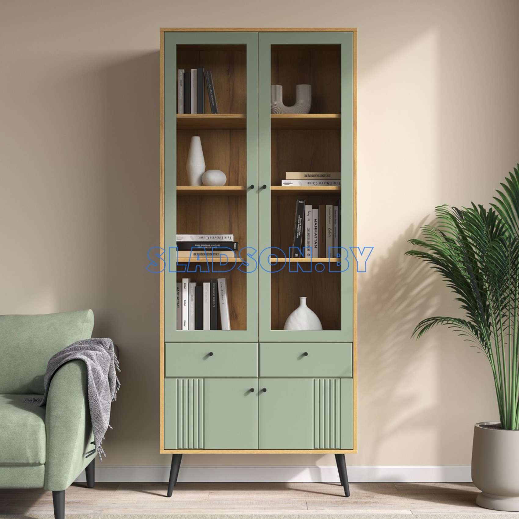 ВЕГА САКСОНИЯ гостиная Пенал-витрина 2-х дверная Дуб золотой Крафт, Серо-зеленый