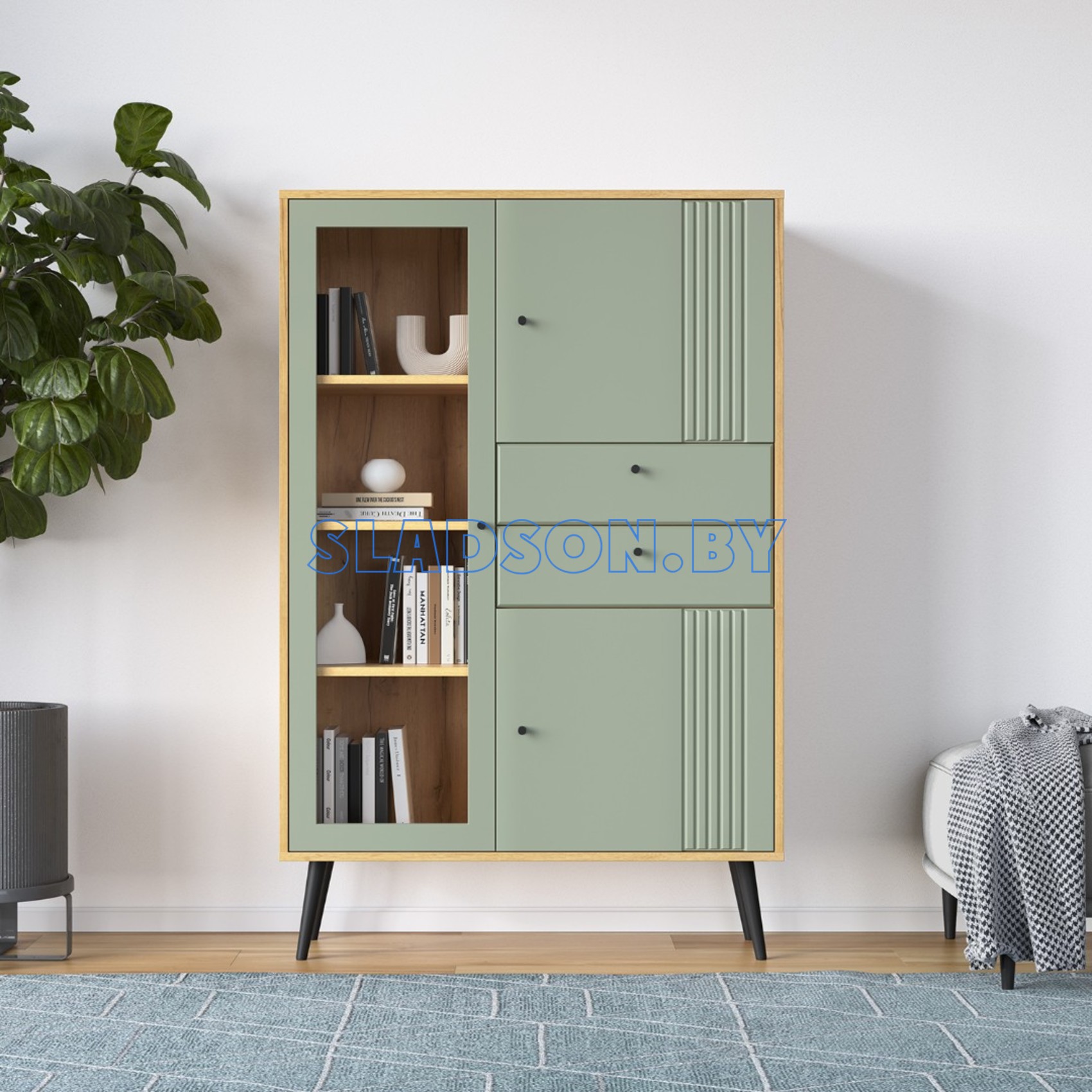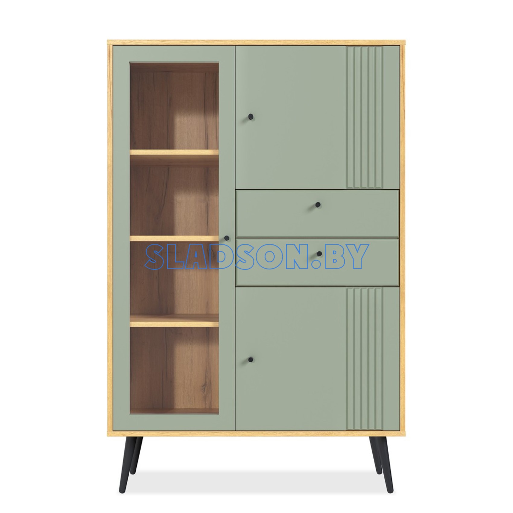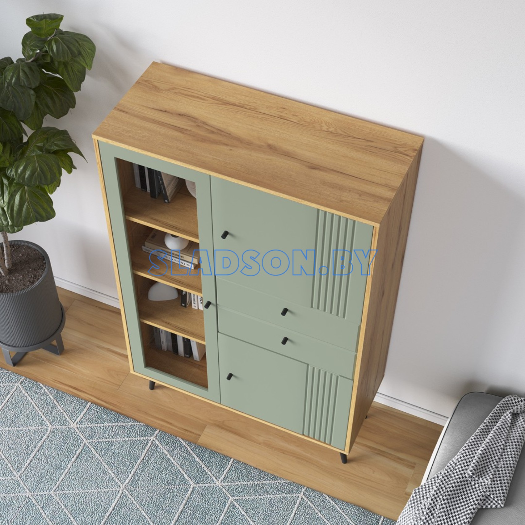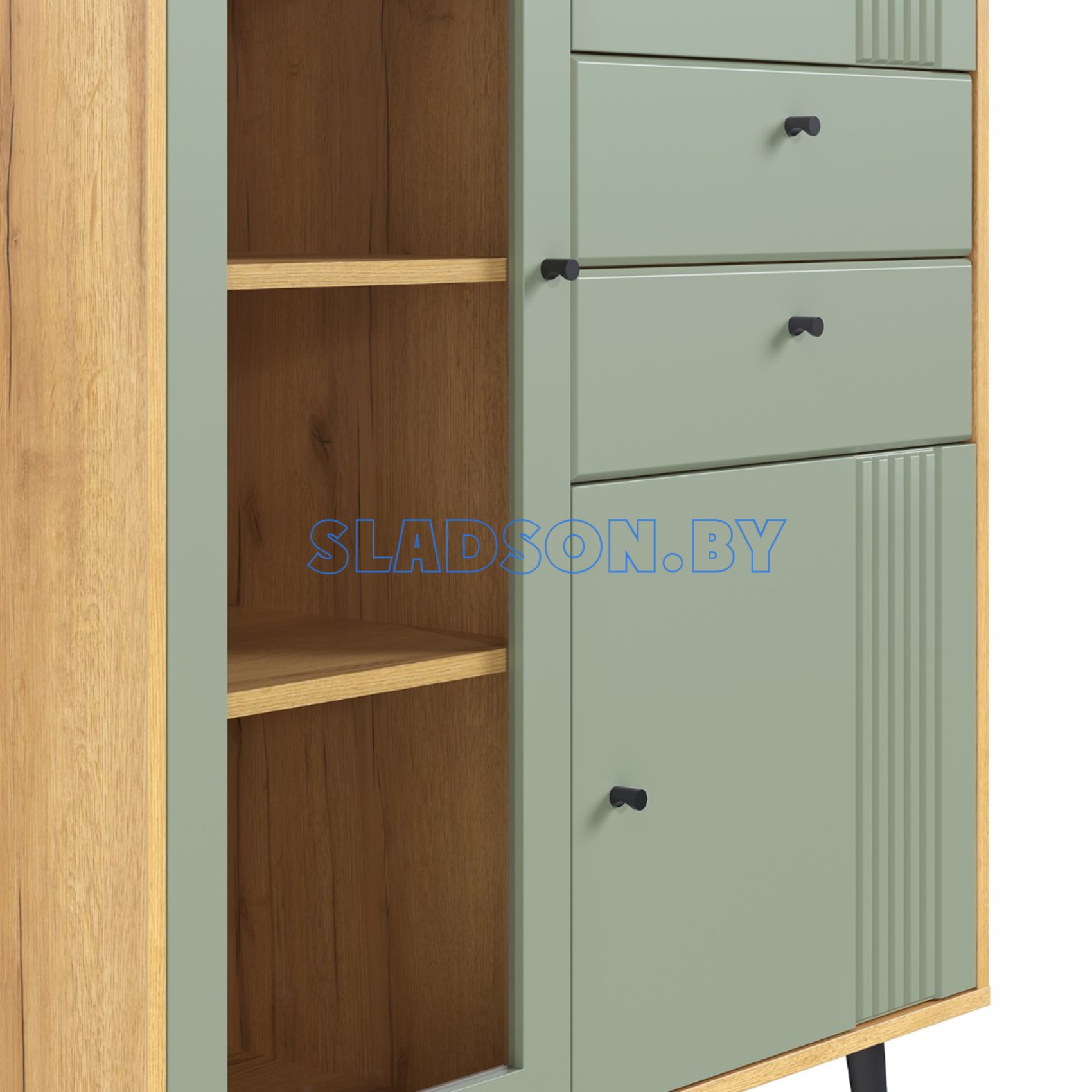 ВЕГА САКСОНИЯ гостиная Комод высокий 1в2дв2ящ Дуб золотой Крафт, Серо-зеленый
