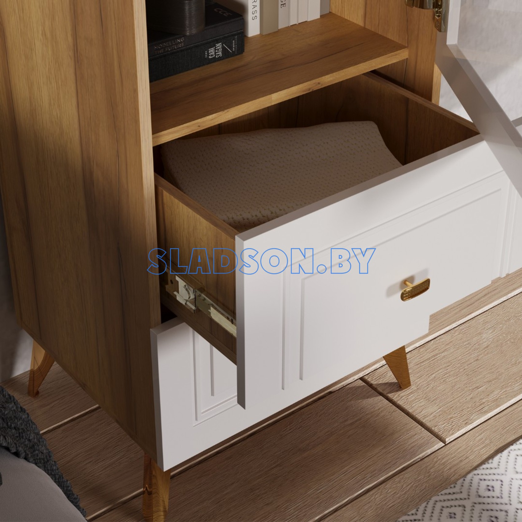 Витрину со стеклом отличает вместительность и функциональность. Дверка со стеклом создает открытое пространство для хранения и демонстрации красивых предметов, а закрытое отделение и ящик позволят разместить различные бытовые мелочи и предметы обихода. Для вашего комфорта, двери оснащены доводчиком для плавного закрывания. Высота металлических опор: 12,5 см, что делает образ мебели легким и грациозным, а также обеспечивает легкую уборку.