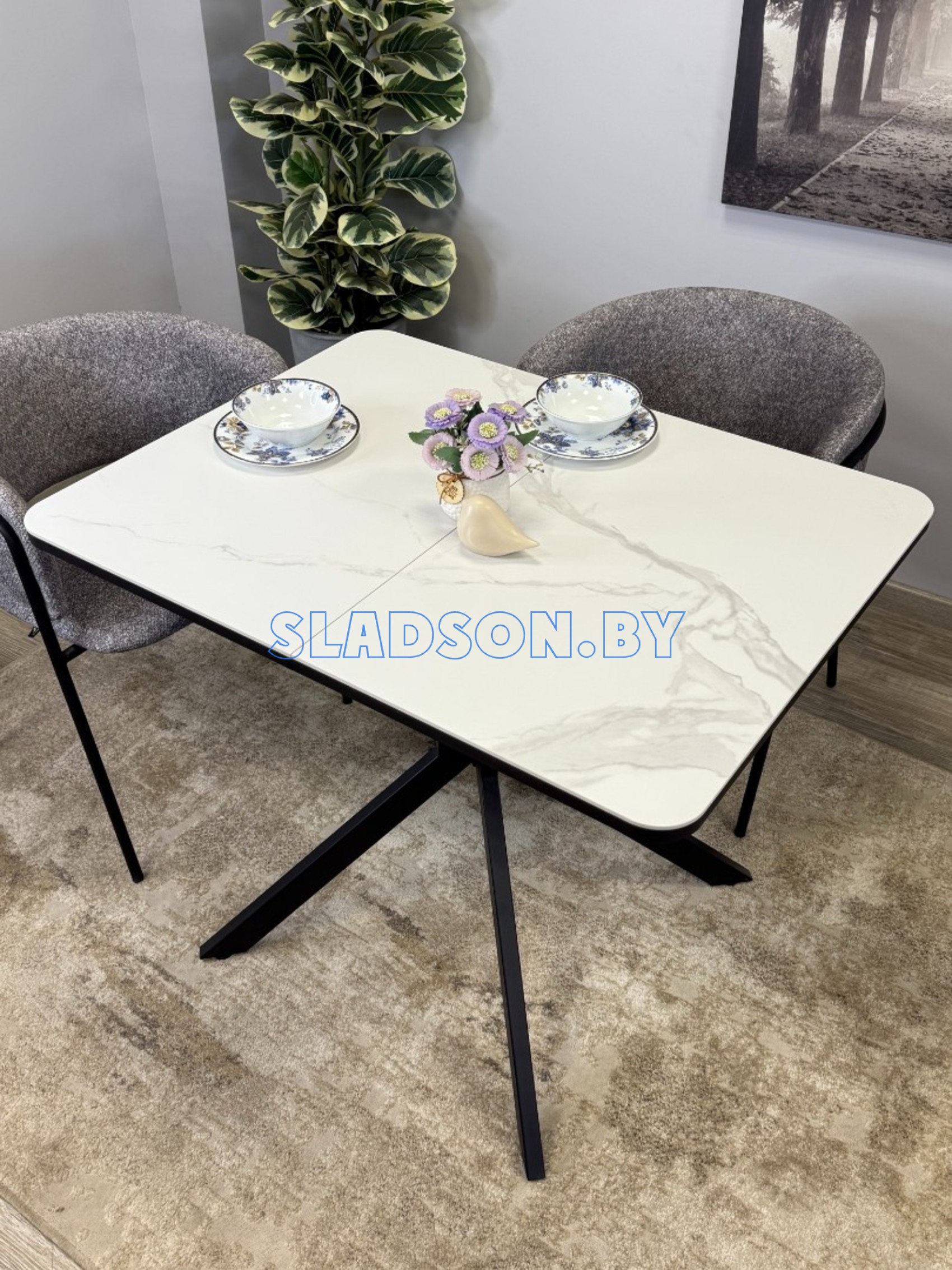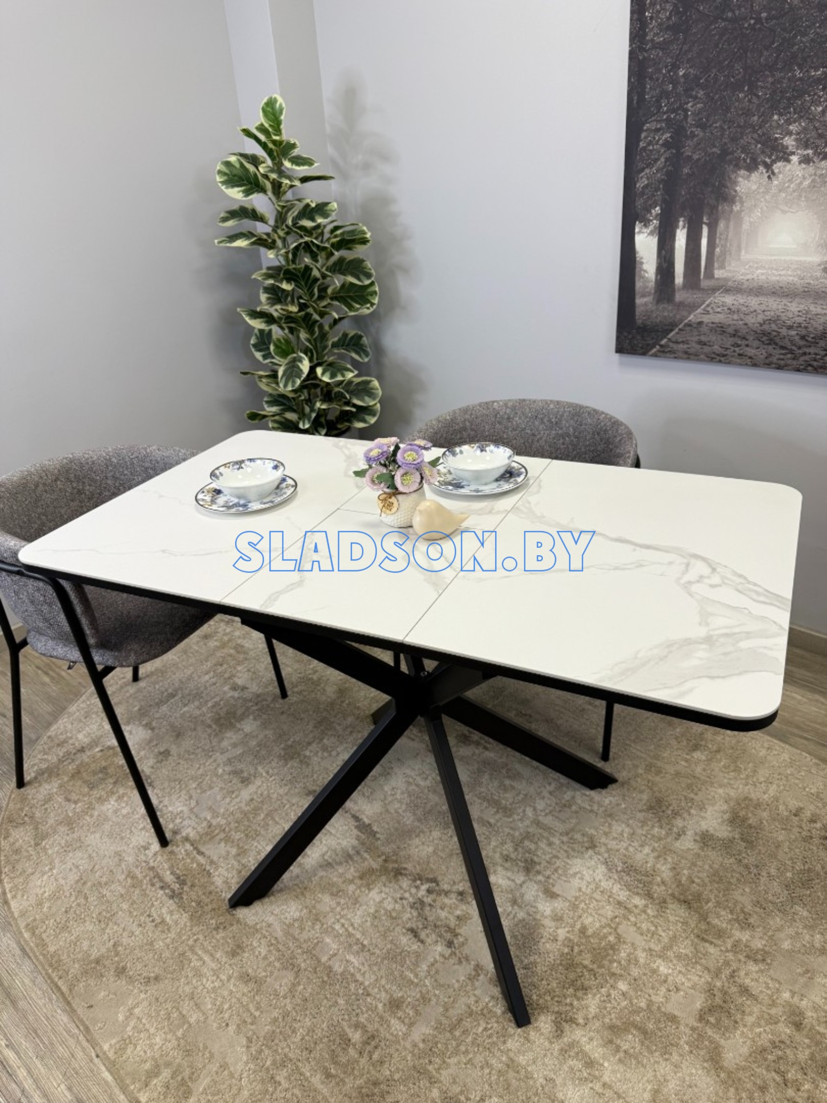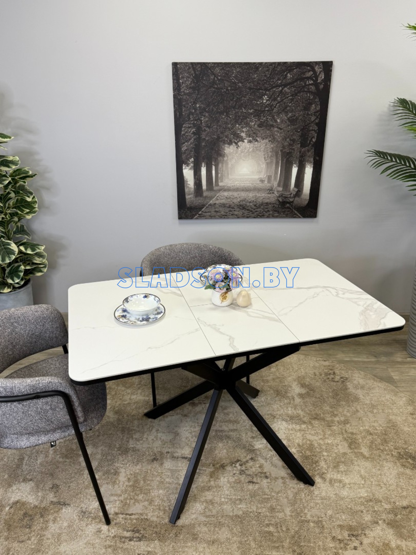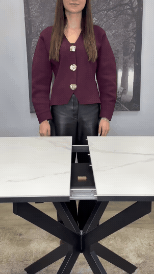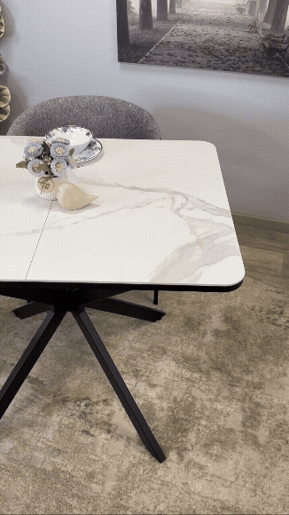 Прямоугольный компактный стол c удобной и легкой раскладкой по центру. Керамическая столешница защищает стол от любого внешнего воздействия, а благодаря центральной опоре к столу удобно сесть с любой стороны.