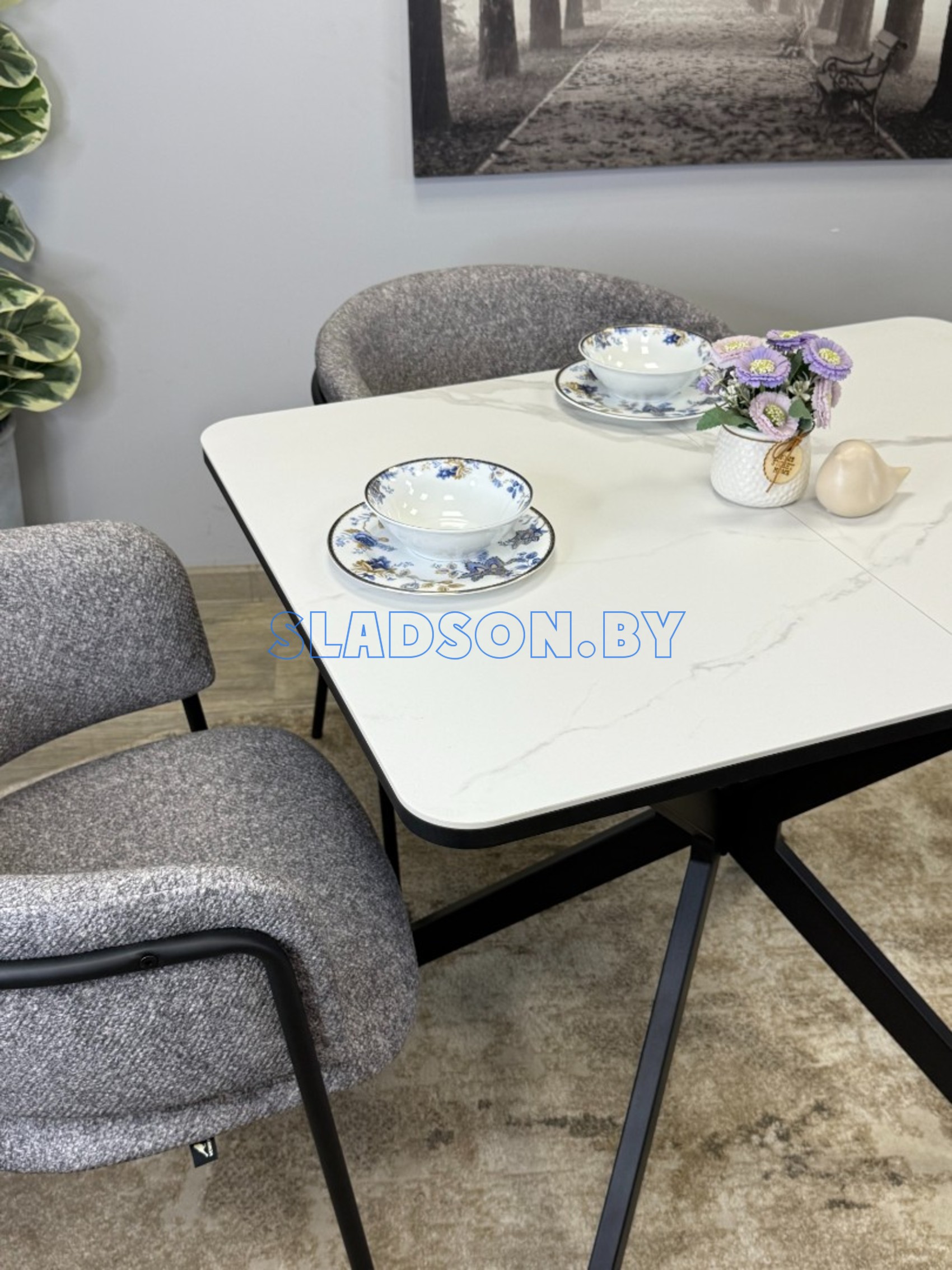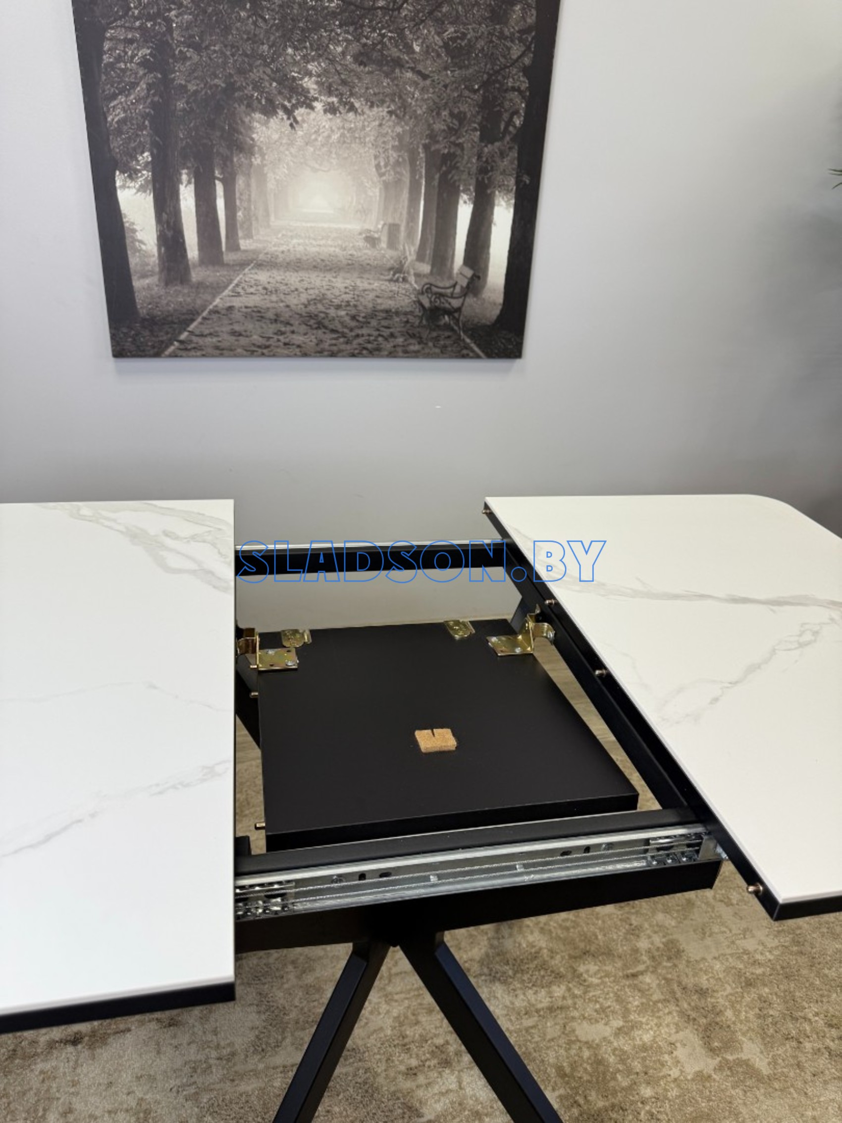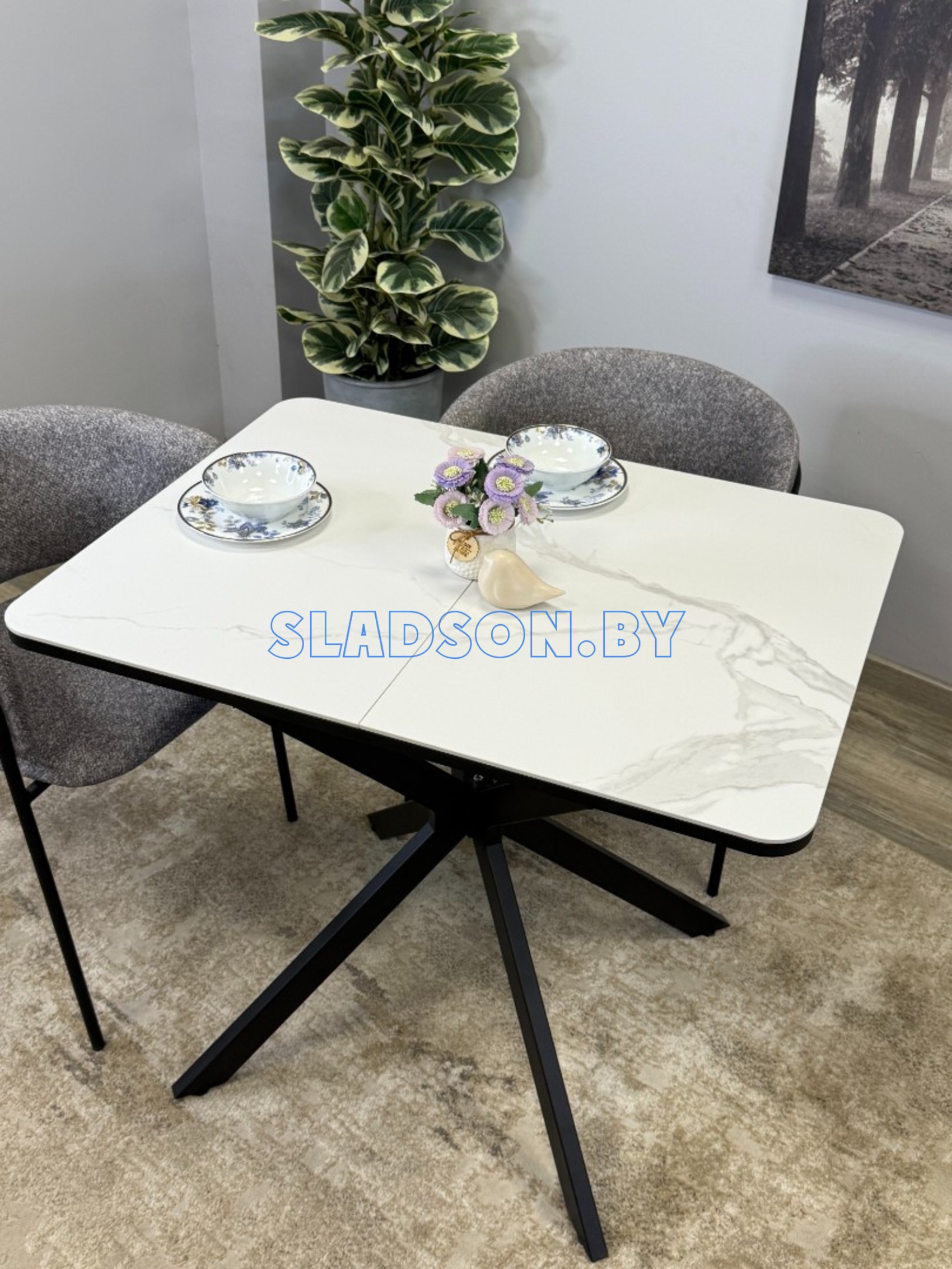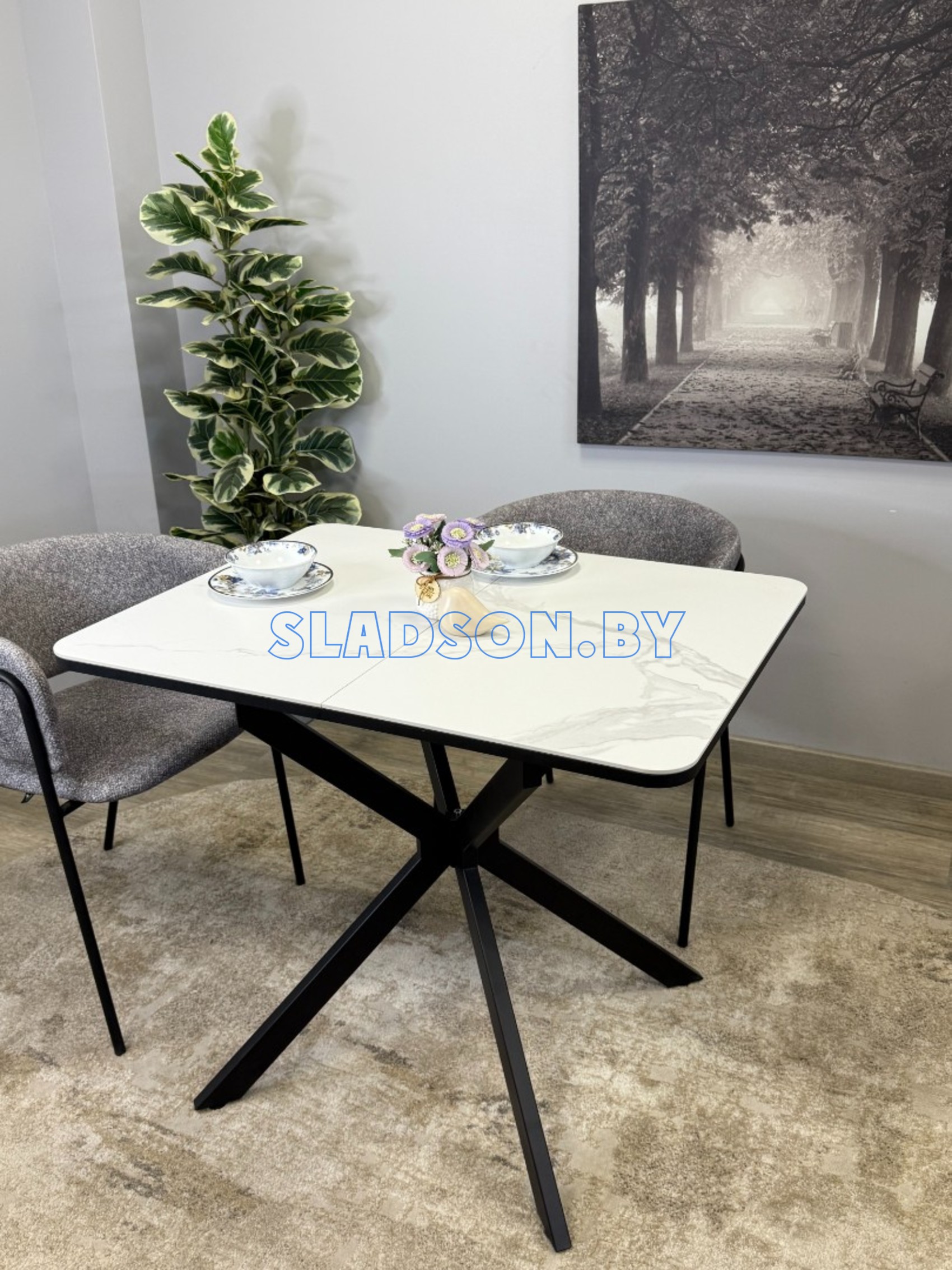 Прямоугольный компактный стол c удобной и легкой раскладкой по центру. Керамическая столешница защищает стол от любого внешнего воздействия, а благодаря центральной опоре к столу удобно сесть с любой стороны.