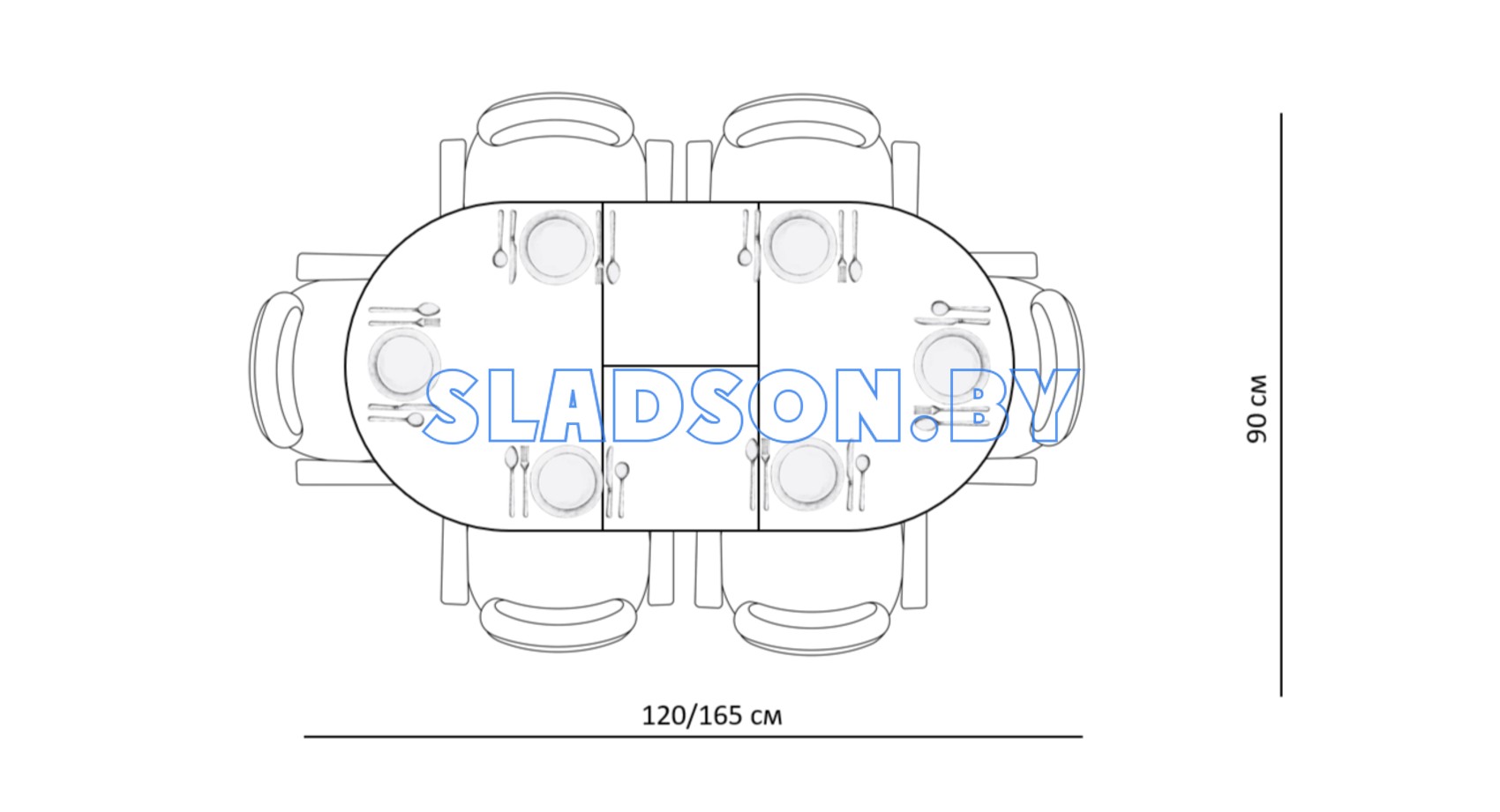 Овальная столешница размером 1200*900 оптимальна на большой кухне. Можно ставить вплотную к стене, легко размещается 6 чел в сложенном виде.