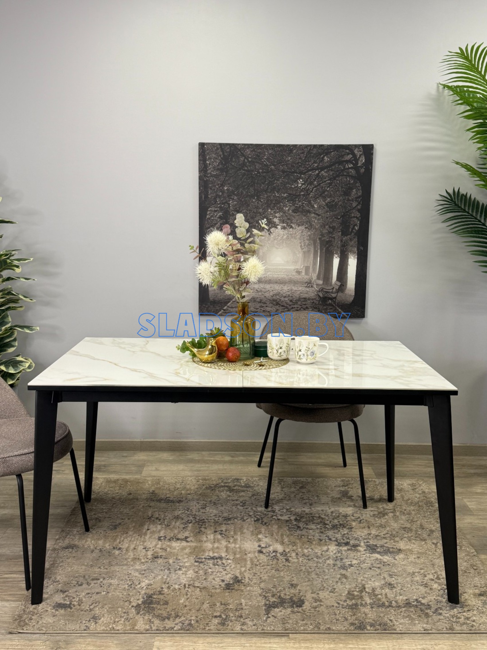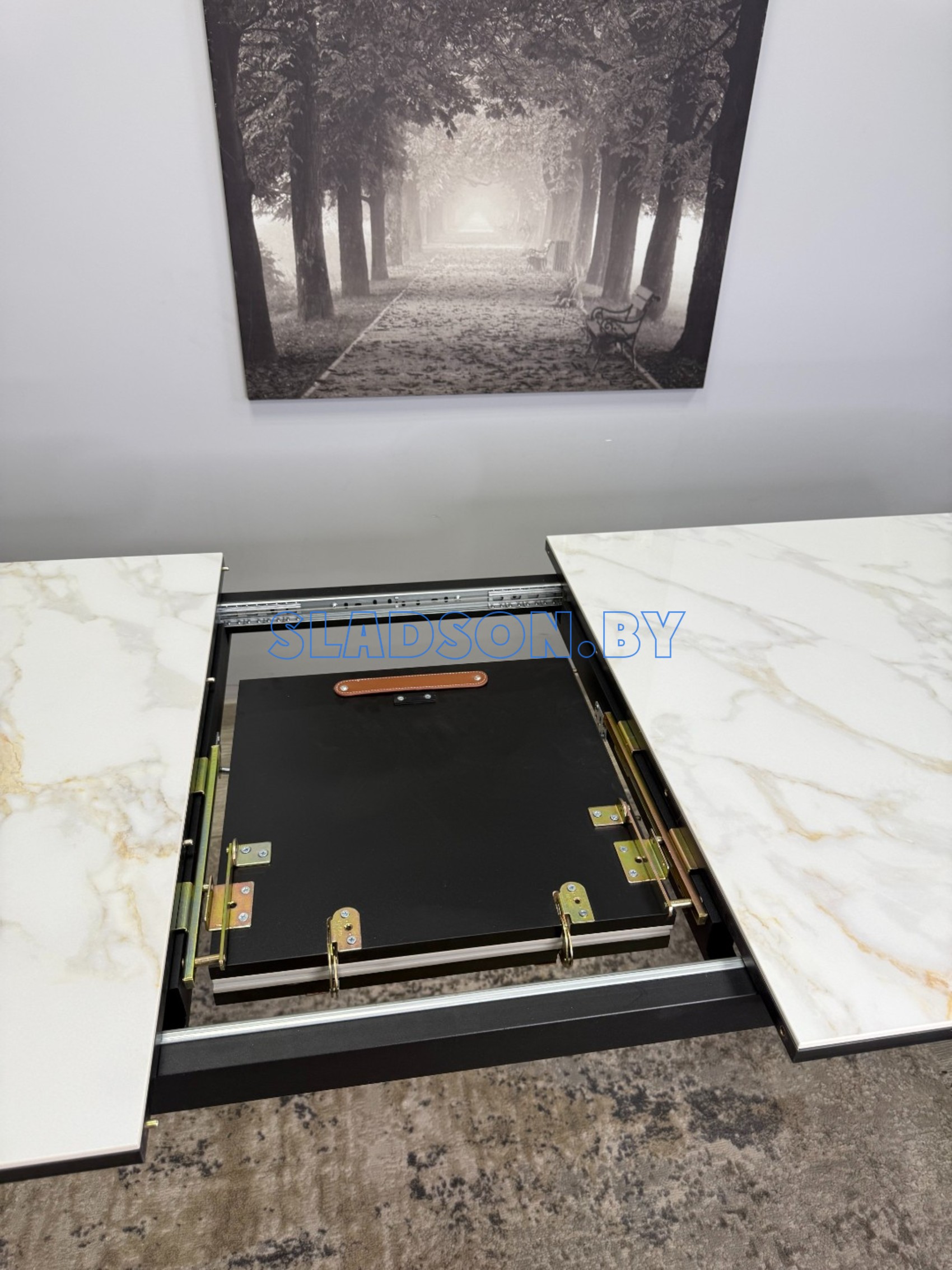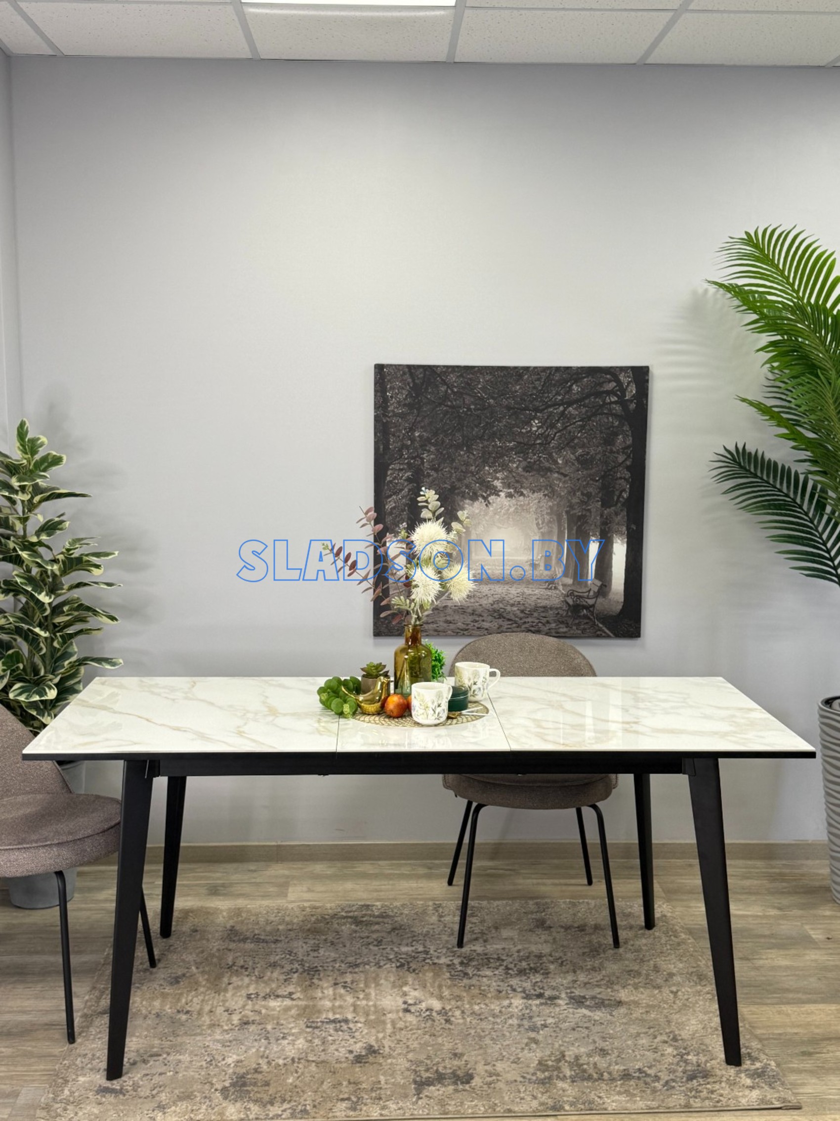 Стол с керамической столешницей и красивыми, функциональными опорами. Керамических столов такого размера очень мало, а размер 140*80 см оптимален для кухни до 13 кв. м. Система раскладки увеличивает стол еще на 40 см благодаря синхронному механизму раздвижения и прогрессивного механизму вставки "бабочка". Вставка с керамикой очень тяжелая и требует специального механизма, предназначенного для керамики. Стол сможет разложить даже ребенок.