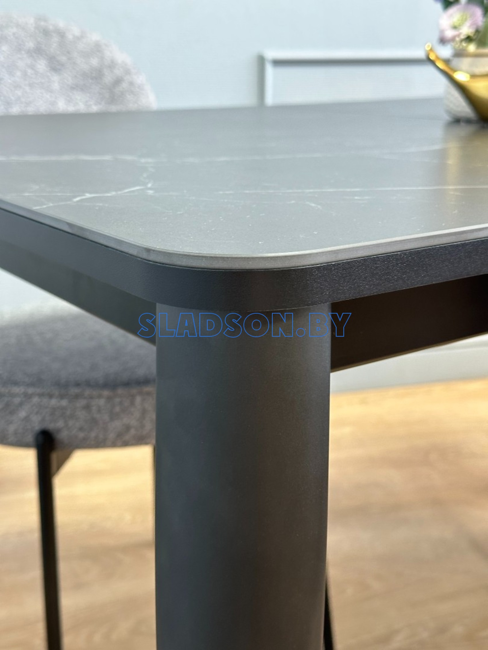 В столе используются дизайнерские опоры, которые Вы не встретите у других столов. Тонкие, очень прочные, они дают достаточную ширину для того, чтобы поставить 2 больших стула по широкой стороне стола. Обеспечивают столу идеальную устойчивость.